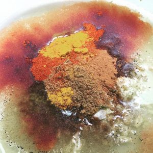 Today’s effort is one of my recent favorites, an oven-roasted chicken shawarma. I love making the marinade, the beauty and the multitude of spices, the artistic splashes they make together in the glass bowl—tumeric and paprika, fresh ground pepper and kosher salt, a solid, heady helping of cumin, all spreading in a swirl across the surface of the olive oil. I love mincing garlic—at least six cloves crushed, then peeled, then finely minced.