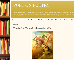 I first thought the mission was to put a site up and get to know some people so when I wrote a poetry book, I might have a set of fans. I quickly changed the mission finding out that I really love promoting others even more than myself. I love finding a new Poet of the Week, or poem to share. I love writing articles about issues that aren’t being discussed in the poetry world. I tend to take on the establishment and there are a lot of poets out there who like that. A lot of poets don’t like how closed and controlled the poetry world has become since the profusion of MFA’s in poetry.